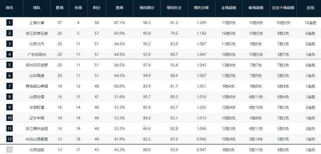 CBA排名又乱了!上海稳居第一,广东遭逆转跌至第4,北京杀进前三